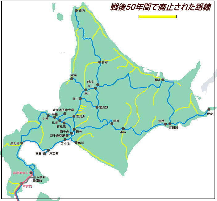 ■・路線図の黄色の部分は、かって北海道に存在していた鉄道路線です。